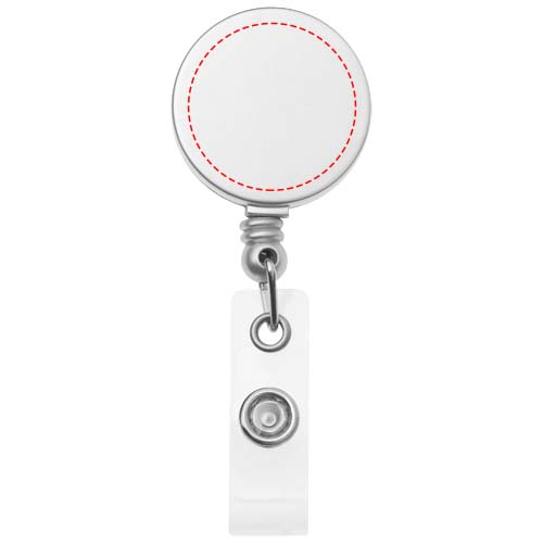 Ausweishalter mit ausziehbarem Metallclip (bis zu 900 mm) mit transparentem Clip und einem Druckknopf um eine Ausweishülle zu befestigen. Der einziehbare Mechanismus erlaubt ein zielgerichtetes Vorzeigen des Ausweises. ø32 x 7 mm