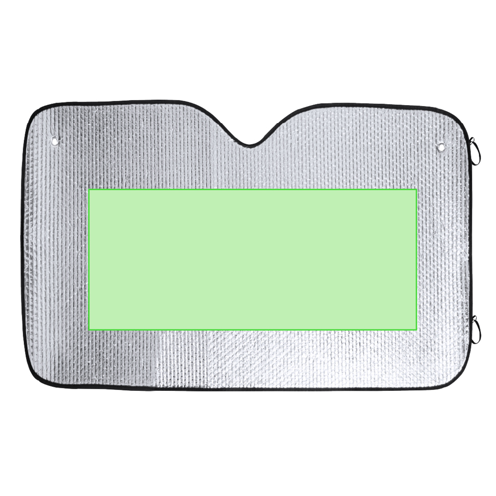 Sonnenschutz mit Vorderseite aus Aluminium und Rückseite aus Schaumstoff. Größe 130 x 60 cm, mit Non-Woven-Rändern und schwarzen Faltgummis. Inklusive 2 Metallringe und zwei Saugnäpfe zur Befestigung an der Windschutzscheibe. Präsentation in ausgebreiteter Form zur einfachen Bedruckung.
