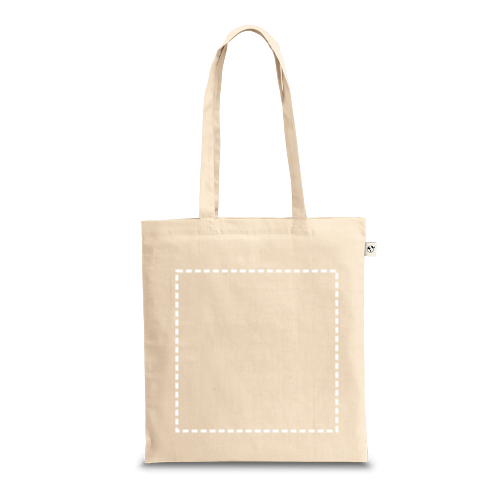 Tasche aus 100% recycelter Baumwolle (180 g/m²), mit 65 cm langen Henkeln. Recycelte Baumwolle ist einfarbig und ungefärbt. Das Rohmaterial wird in seiner ursprünglichen Form und Farbe verwendet, ohne dass Chemikalien zum Färben oder Bleichen eingesetzt werden, was zu einer geringeren Umweltbelastung beiträgt. Die einheitliche Farbe wird durch die Auswahl von recyceltem Garn mit demselben Farbton erzielt, wobei Verunreinigungen und Farbabweichungen auftreten können. 380 x 420 mm