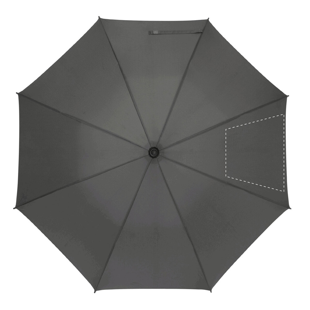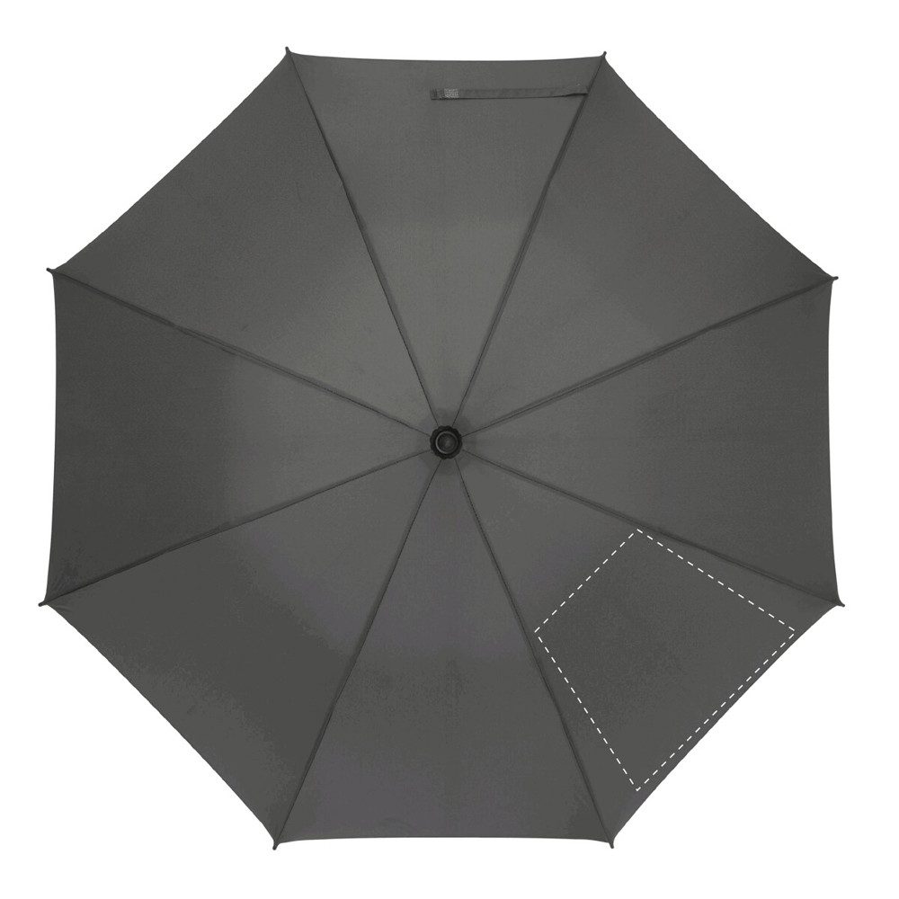Vollautomatischer (öffnen/schließen), windproof Taschenschirm mit 8 Segmenten und silberner Einfassung. Mit Metallgestell, Fiberglasstreben, gummiertem Griff mit Handschlaufe und Schutzhülle. Material: 190T RPET Pongee. In Hartschalenhülle mit Reißverschluss. Marke: André Philippe. Mit RPET-Label
