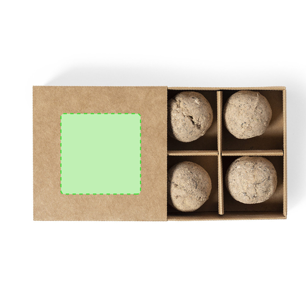 Das Geheimnis des Fliegengewichts ist der inliegende, wasserdichte Pappbecher. Darin befindet sich eine Substrattablette als Erde und der Samen nach Wahl. Viel Platz für die Werbebotschaft bieten die fünf Seiten des umliegenden Kartonwürfels, der komplett individuell gestaltbar ist. Auf der Unterseite ist die Pflanzanleitung.