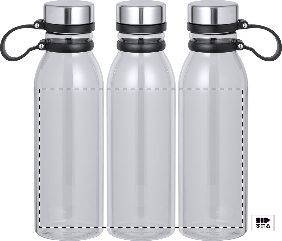 Trinkflasche aus RPET (BPA-frei) mit Tragedeckel aus Edelststahl. Füllmenge: 830 ml. Nicht geeignet für kohlensäurehaltige Getränke.