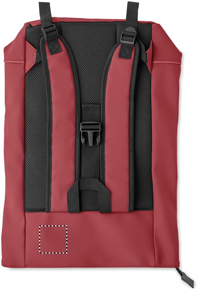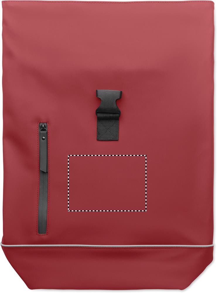 15'' Rolltop-Laptop-Rucksack aus weichem PU. Gepolsterter Rücken und verstärkter Boden mit reflektierenden Streifen. Wasserabweisende Fronttasche mit Reißverschluss. Futter aus 210D RPET-Polyester.