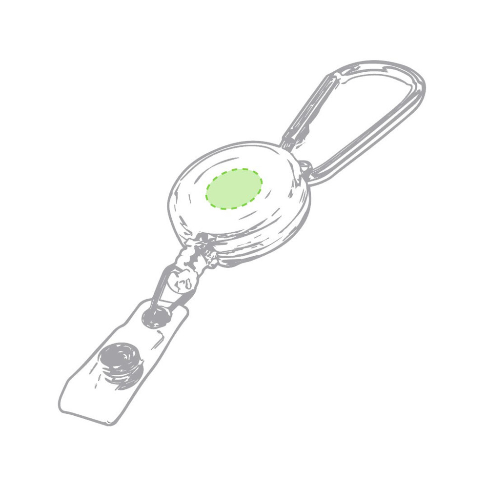 Schlicht gestalteter, ausziehbarer Gegenstandshalter mit Knopfverschlussriemen und Ausziehmechanismus bis zu 65 cm. Einschließlich eines Metallkarabiners und speziell entworfen, um alltägliche Objekte zu tragen und leichten Zugang zu ihnen zu erhalten (berührungssichere Schlüsselanhänger, Sicherheitszeiger, Ausweis...). Große Markierungsfläche auf dem Mittelstück.