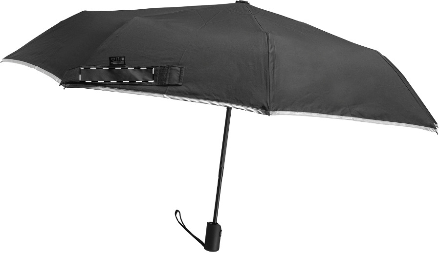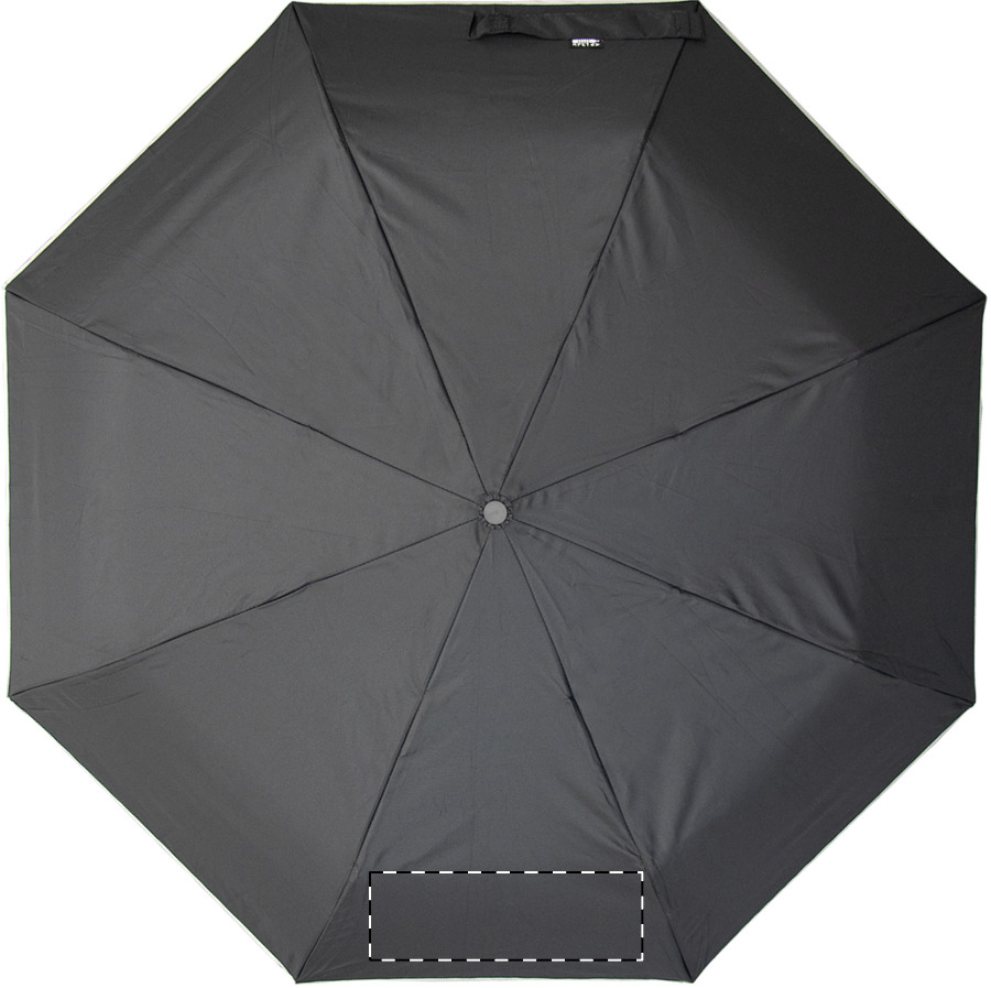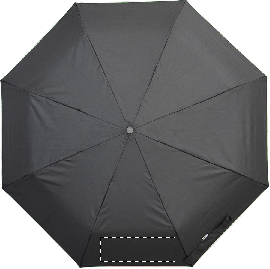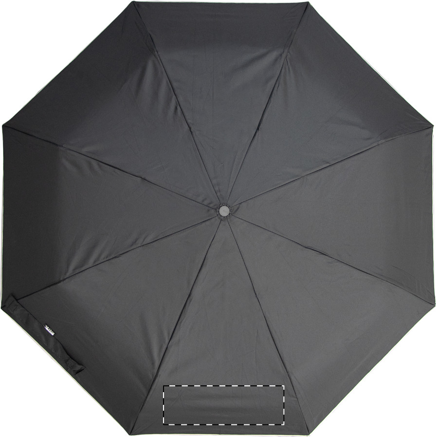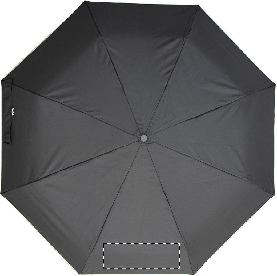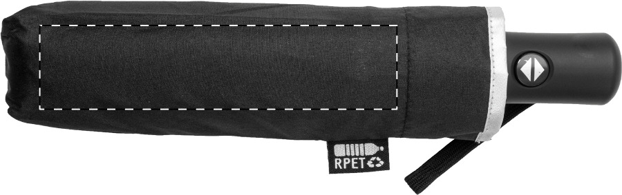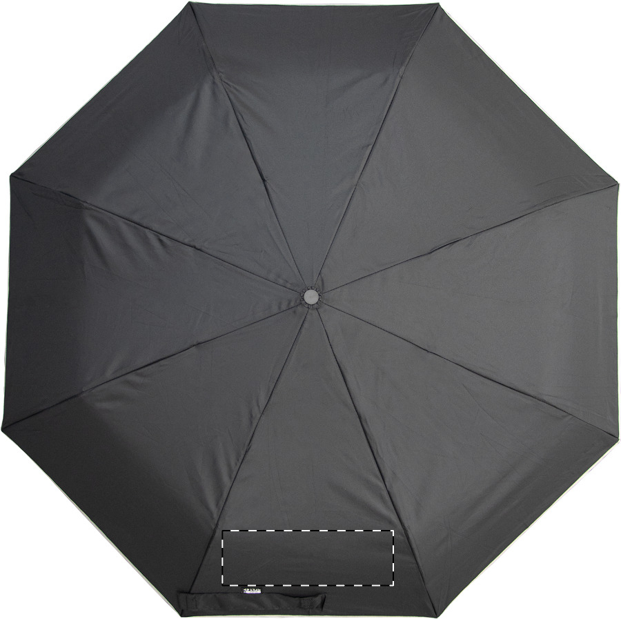 Vollautomatischer (öffnen/schließen), windproof Taschenschirm mit 8 Segmenten und silberner Einfassung. Mit Metallgestell, Fiberglasstreben, gummiertem Griff mit Handschlaufe und Schutzhülle. Material: 190T RPET Pongee. In Hartschalenhülle mit Reißverschluss. Marke: André Philippe. Mit RPET-Label
