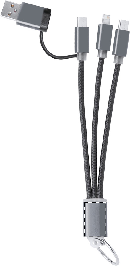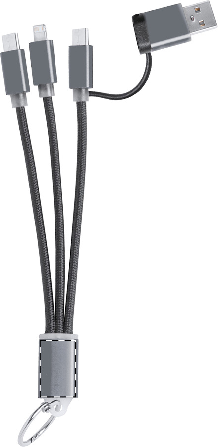 Ladekabel-Schlüsselanhänger aus Aluminium mit Metallring. mit Micro-USB-, USB-C- und Lightning Anschlüssen. Mit USB- und USB-C-Eingängen.