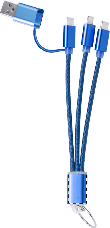 Ladekabel-Schlüsselanhänger aus Aluminium mit Metallring. mit Micro-USB-, USB-C- und Lightning Anschlüssen. Mit USB- und USB-C-Eingängen.