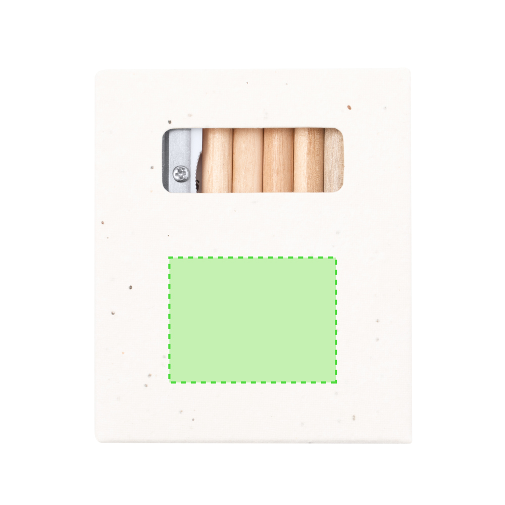 Set aus 6 Stiften mit Malschablonen und Anspitzer, präsentiert in einer natürlichen Kartonschachtel mit Samen. Holzstifte mit rundem Körper mit natürlicher Oberfläche und Minen in einer breiten Palette von Farben. In der Schachtel sind Petuniensamen enthalten, so dass der Karton am Ende seiner Nutzungsdauer bepflanzt werden kann. Blumen in verschiedenen Farben, mit Pflanzanleitung auf der Rückseite.