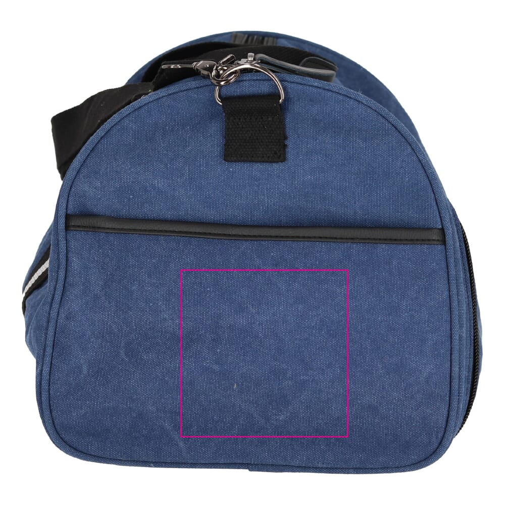 Elegante Reisetasche aus recyceltem Baumwoll-Canvas. Mit 100% recyceltem, reflektierendem Gurtband, luxuriösen Reißverschlüssen und Griffen sowie einem Futter aus 100% recyceltem Polyester. Mit seitlichen Tragegriffen, verstellbarem, abnehmbarem Schultergurt, 1 Seitentasche, 2 Vordertaschen und 3 Innentaschen, eine davon mit Reißverschluss.
