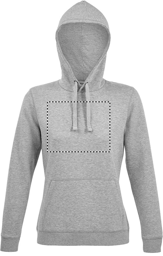 SOL'S SPENCER Damen Sweater 280g. Kängurutasche. Seitennähte. Gefütterte Kapuze mit Zugband. Feinrippeinfassung an Ärmelbündchen und Saum 2x2. Halbmondpasse auf der Krageninnenseite. Nackenband auf der Krageninnenseite. Material: 80% Baumwolle Ringspun - 20% Polyester. Innen angeraut. Außenmaterial 100% Baumwolle. OEKO-TEX®. Verkauf nur inklusive Werbeanbringung.