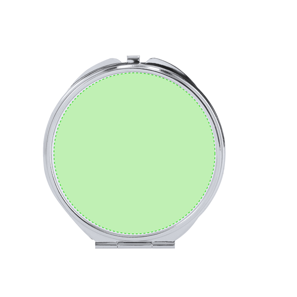 Faltbarer metallischer Spiegel mit Sublimationsfläche (nicht im Produkt integriert, ideal zum Drucken und späteren Aufkleben). Mit zwei Innenspiegeln: 1X und 2X-Vergrößerung.