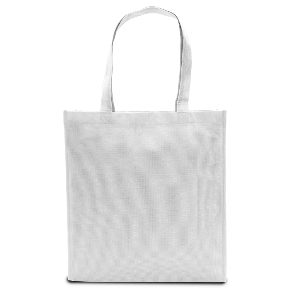 Weiße Tragetasche mit kurzen Griffen aus Leichtfaser. Verschiedene Abmessungen bei Bestellungen ab 10.000 Stück lieferbar.