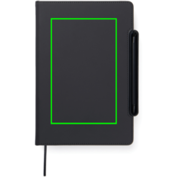 A5 Notizbuch mit Cover aus 300D RPET Polyester mit 80 blanko Seiten und farblich abgestimten Gummiband, Lesezeichen sowie Stifteschlaufe.