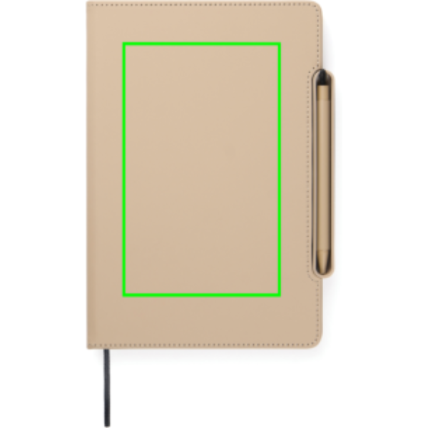 DIN A5 Notizbuch mit gebundenem Cover aus 60% recyceltem Polyester und 40% PU. 128 Blatt (256 Seiten) liniertes 70 g/m² Recyclingpapier. Mit 2 Lesebändchen.