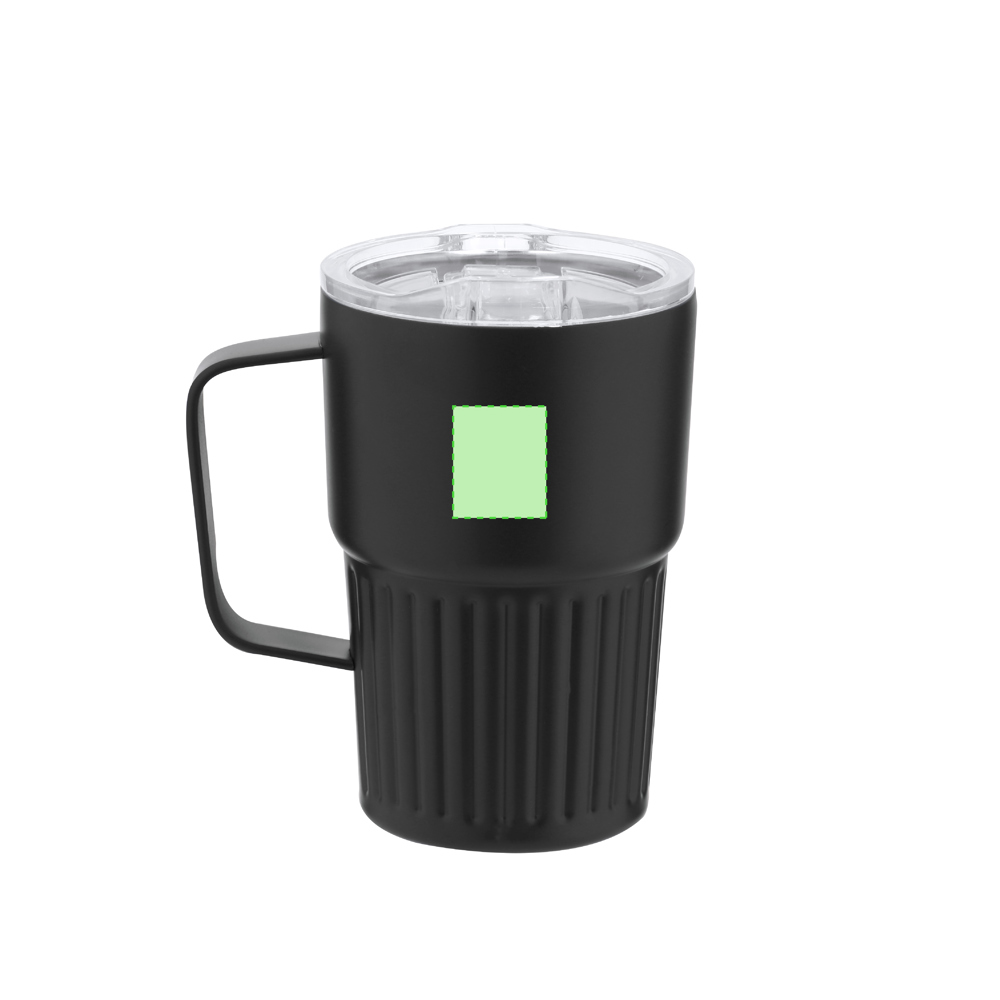 Doppelwandiger Becher aus Edelstahl mit PP-Griff. Füllmenge: 300 ml.
