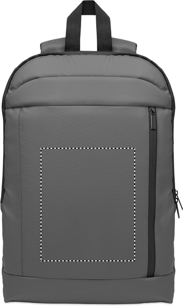 15'' Rolltop-Laptop-Rucksack aus weichem PU. Gepolsterter Rücken und verstärkter Boden mit reflektierenden Streifen. Wasserabweisende Fronttasche mit Reißverschluss. Futter aus 210D RPET-Polyester.